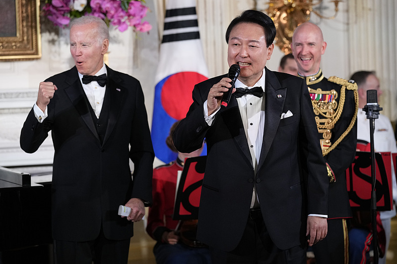 《纽约时报》曾发文称,韩国数十年来一直是美国在亚洲地区最重要的盟友之一。拜登上任后,对韩国也“特别重视”。 2023年,尹锡悦到美国进行国事访问,拜登在白宫为尹锡悦举行国宴,身着燕尾服的尹锡悦还为来宾演唱了美国民谣摇滚创作型歌手唐·麦克林的《美国派》。